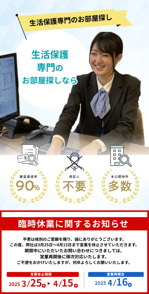 • 生活保護受給中でお部屋探しのお客様は少なからず同じお悩みの方は多い印象です。